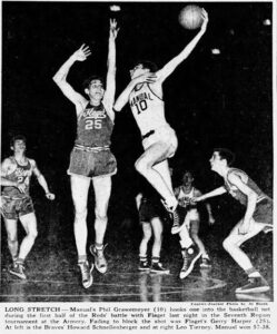 Phil “Cookie” Grawemeyer led the duPont Manual Crimsons to statewide basketball prominence in 1951 and 1952. The Crimsons compiled a 66-5 record over two seasons and challenged for the coveted state title both years. With 6’7″ Grawemeyer leading the way, his teams lost heartbreakers in the semi-finals in 1951 and the finals in 1952. He was named to the 1951 and 1952 Sweet 16 All-State Tournament teams and the Courier-Journal All-State Teams. Phil scored 29 points to lead Manual to the championship of the 1952 Louisville Invitational Tournament (LIT). He earned a basketball scholarship to the University of Kentucky and was a member of the 1953-1954 Kentucky Wildcat’s undefeated team. Phil Grawemeyer’s team jersey was retired and now hangs in the rafters of Rupp Arena.